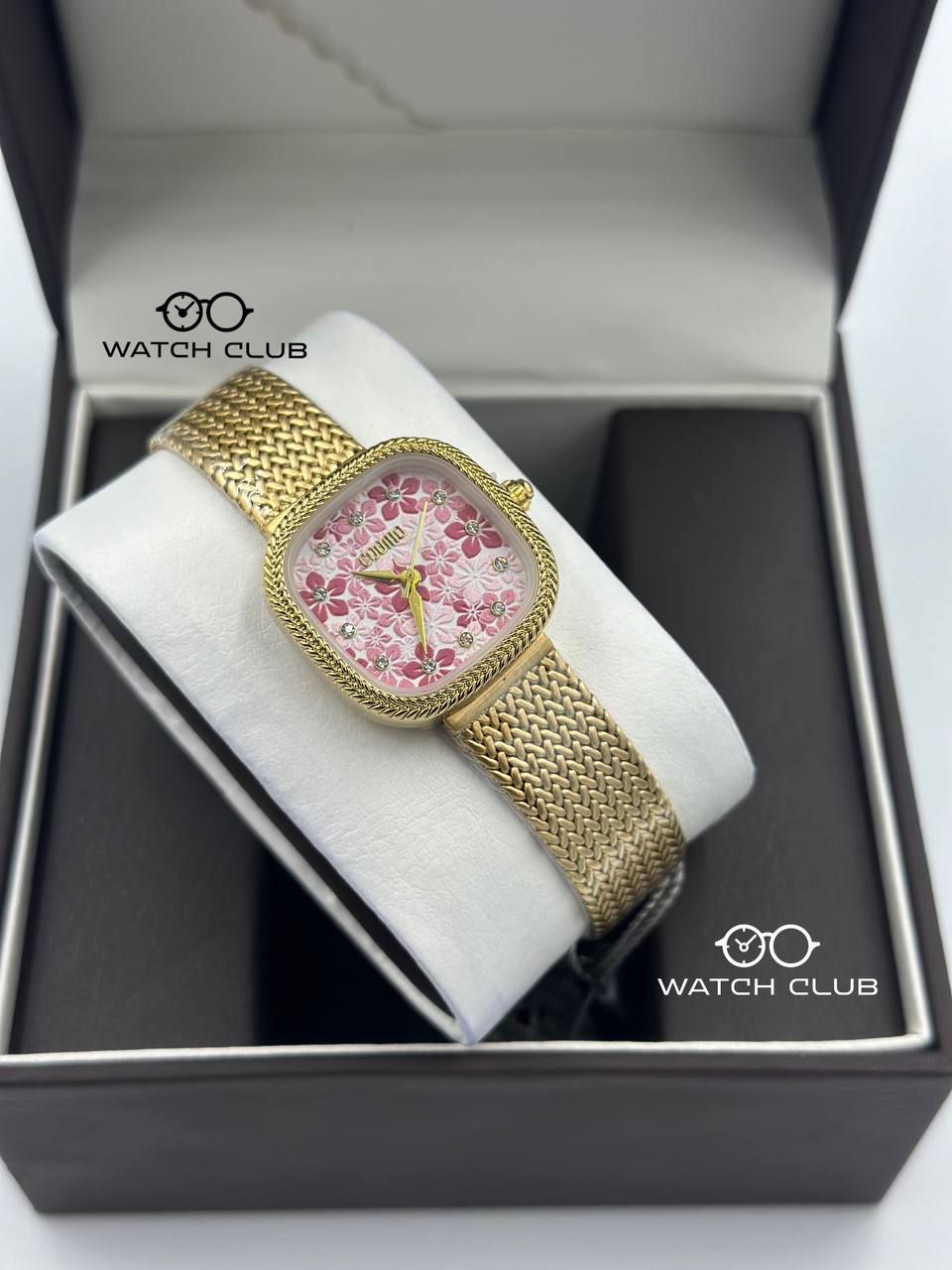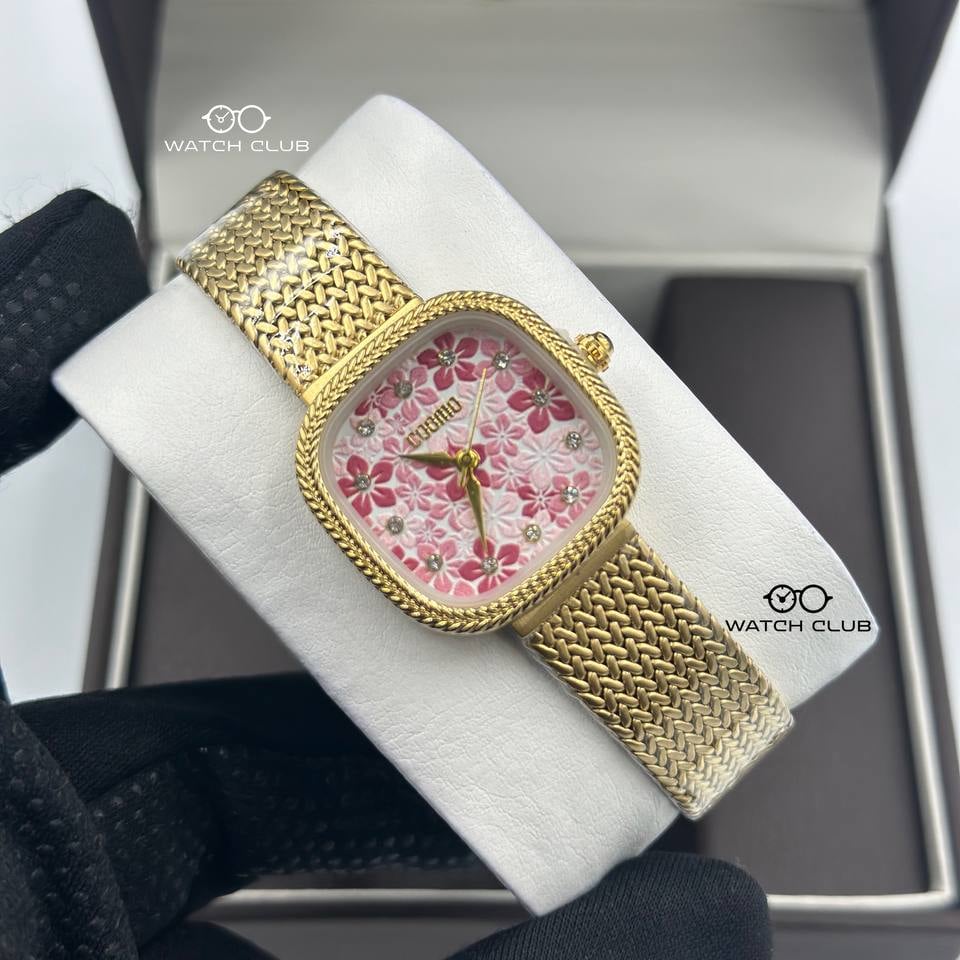 استمتعي بأقصى درجات الأناقة والتألق مع ساعة كومو الذهبية بمينا وردي وإطار مربع – الرفيق المثالي لكل لحظة من يومك.