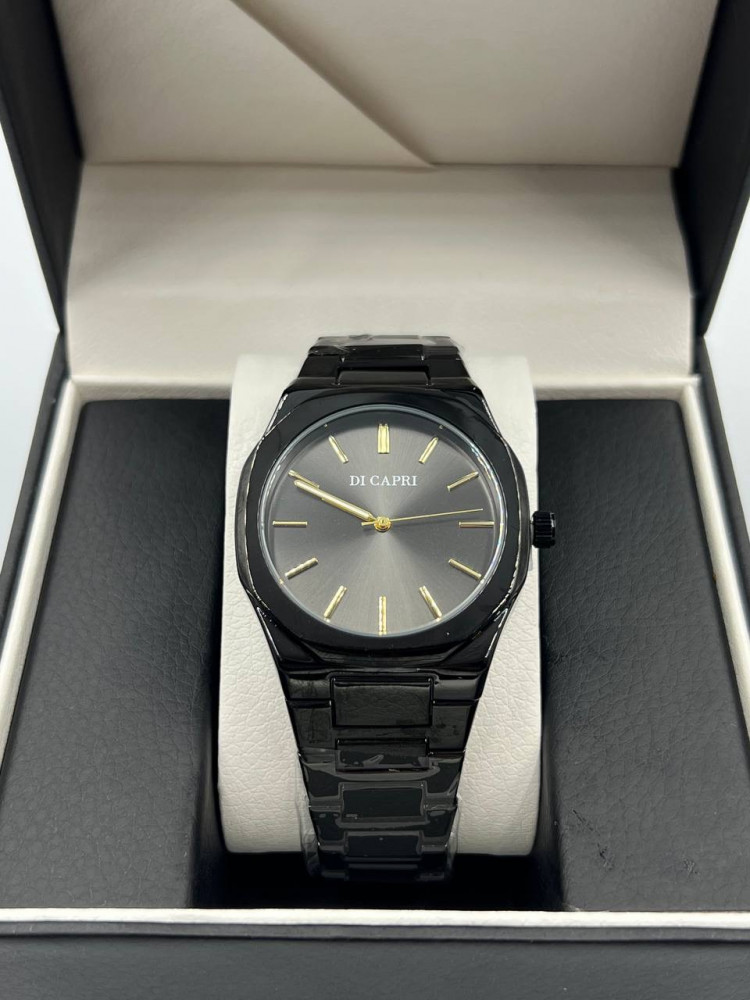 ساعة دي كابري الفاخرة تأتي بتصميم أنيق يجمع بين المظهر الأسود الكلاسيكي وعقارب ذهبية لامعة، مما يمنحها لمسة من الفخامة الراقية.