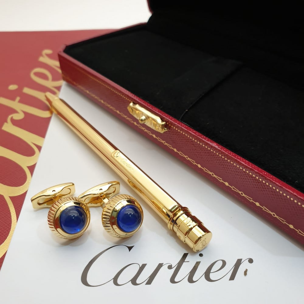 قلم كارتيه الذهبي مع أزرار الأكمام هو تجسيد للفخامة الرفيعة والأناقة المطلقة.