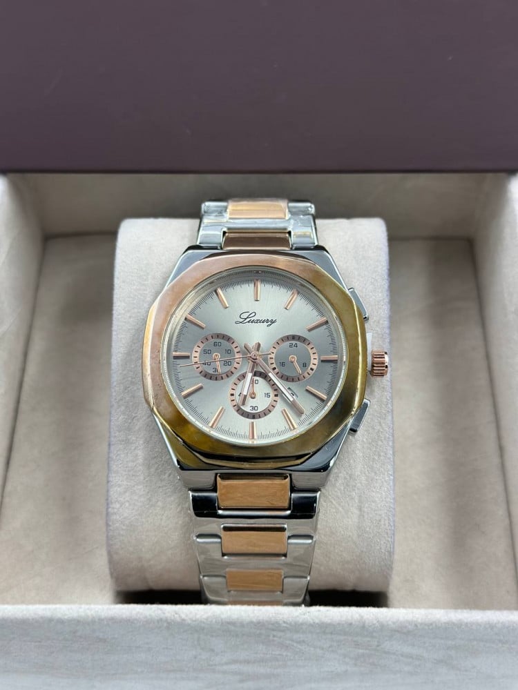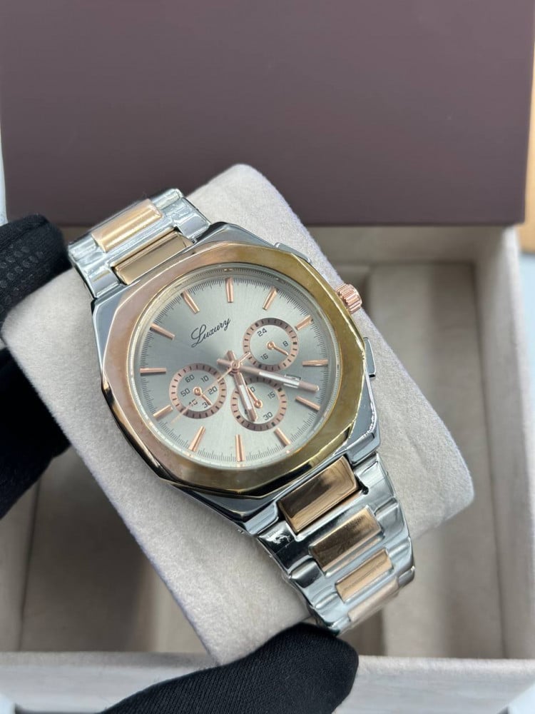 ساعة الكرونوغراف الفاخرة بطلاء الروز جولد وقرص المينا الرمادي تعتبر تجسيدًا حقيقيًا للأناقة والرقي حيث تم تصميم هذه الساعة بدقة فائقة لتلبية احتياجات الرجال العصريين الذين يقدرون الفخامة والجودة العالية في الوقت ذاته. مع الحفاظ على التوازن المثالي بين الجمال والأداء الوظيفي، تأتي هذه الساعة لتكون الخيار الأمثل للمناسبات الرسمية والاحتفالات الخاصة.