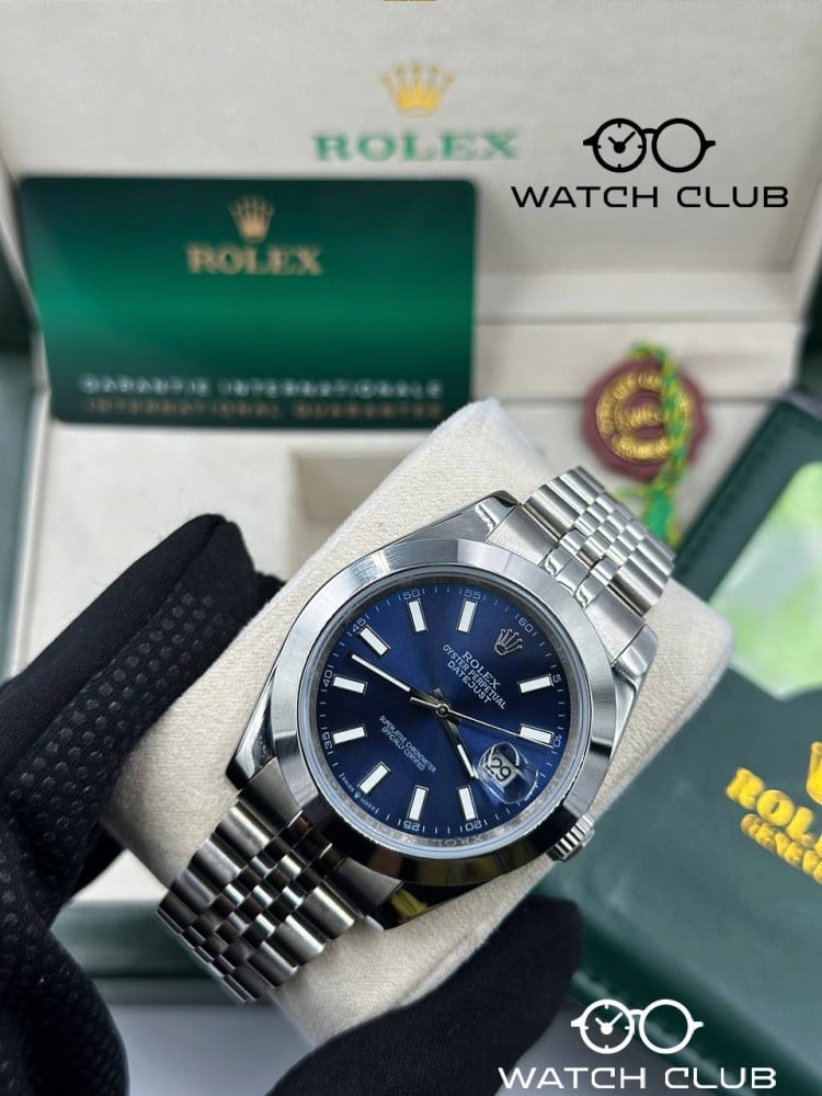 تجسد ساعة رولكس الفضية بمينا كحلي وإطار ناعم الأناقة العصرية و التميز في عالم الساعات الفاخرة.