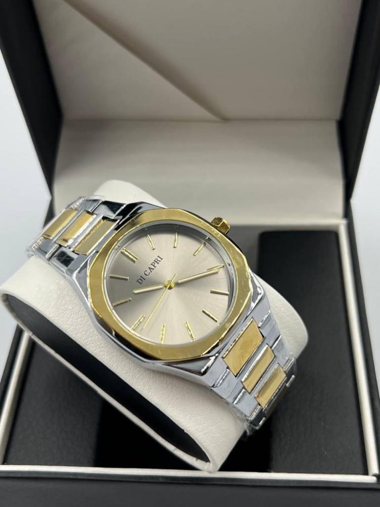 ساعة دي كابري الفاخرة بتصميم فضي وذهبي مع مينا رمادي هي تعبير راقٍ عن الأناقة والتفرد.