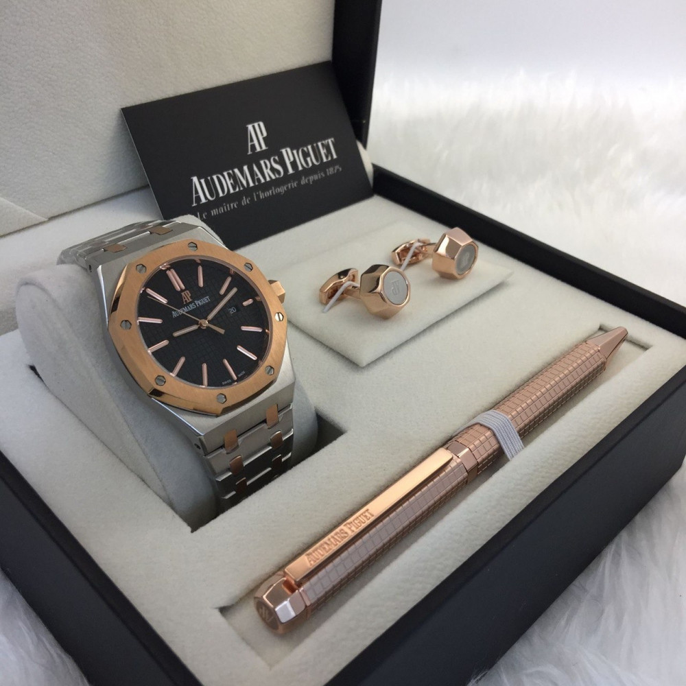 يشمل هذا الطقم الرائع أربعة عناصر أساسية: كبك فضي ونحاسي، قلم نحاسي، وساعة مزيج فضي ونحاسي بمينا أسود. كل قطعة في هذا الطقم