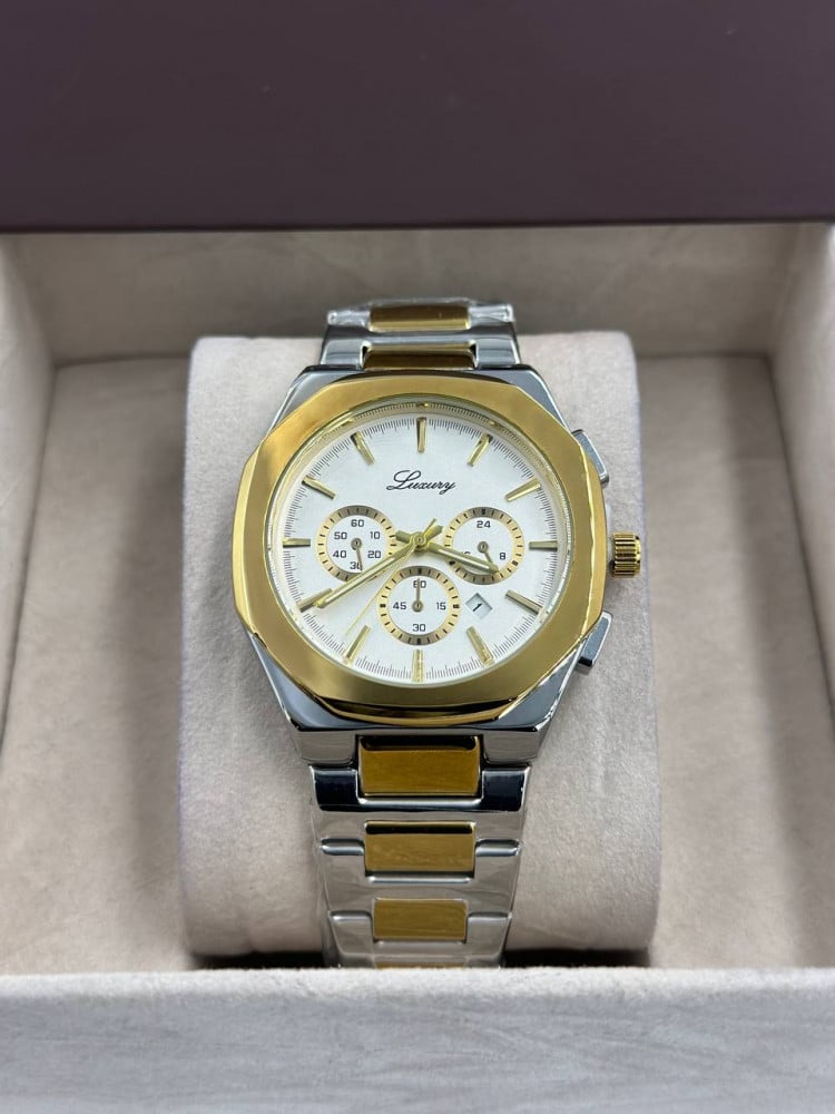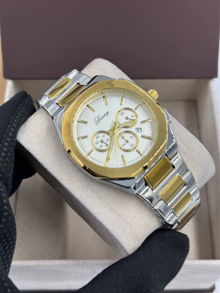تمثل ساعة الكرونوجراف الفاخرة هذه مزيجًا رائعًا من الجمال والتكنولوجيا، مع تصميم يجمع بين الذهب والفضة ليعكس ذوقك الرفيع وأسلوبك المتميز. إنها ليست مجرد ساعة، بل قطعة فنية تعكس شخصيتك وتضفي لمسة من الفخامة على مظهرك اليومي.